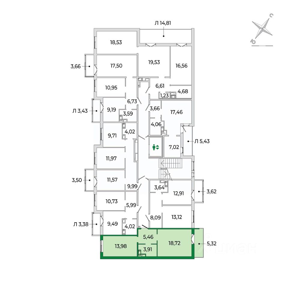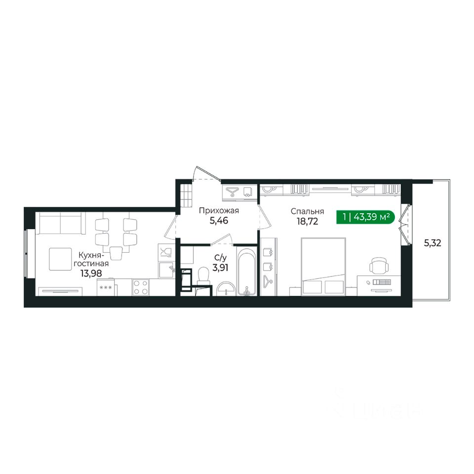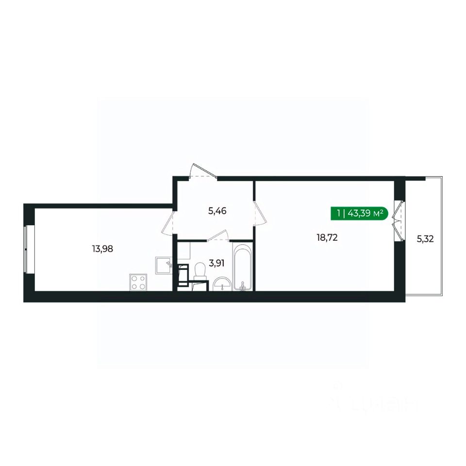 Кухня (14 м2) и комната с балконом разделены прихожей и санузлом и имеют правильную геометрию.