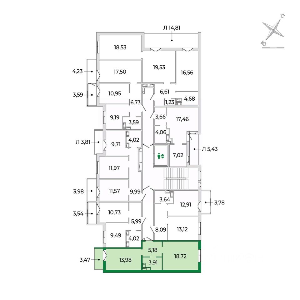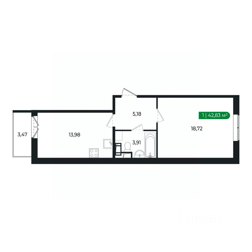 Кухня с балконом и комната (18м2) разделены прихожей и санузлом и имеют правильную геометрию.