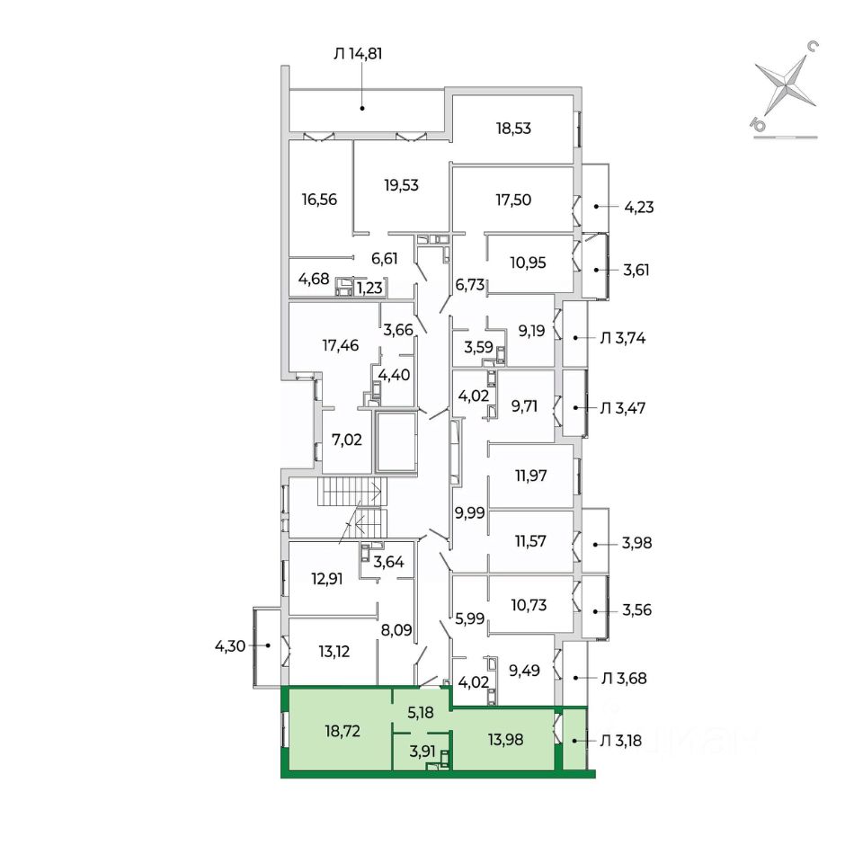 Кухня с балконом и жилая комната (18м2) разделены прихожей и санузлом и имеют правильную геометрию.
