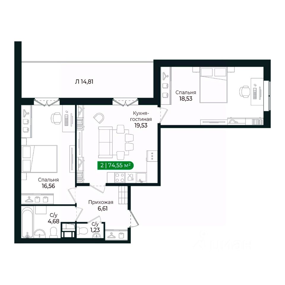 Напрямую продаётся 2 комнатная квартира 265 на 2 этаже (из 8) общей площадью 74,55 м2 в III очереди в жилом комплексе Сертолово Парк от застройщика ГК Алгоритм.