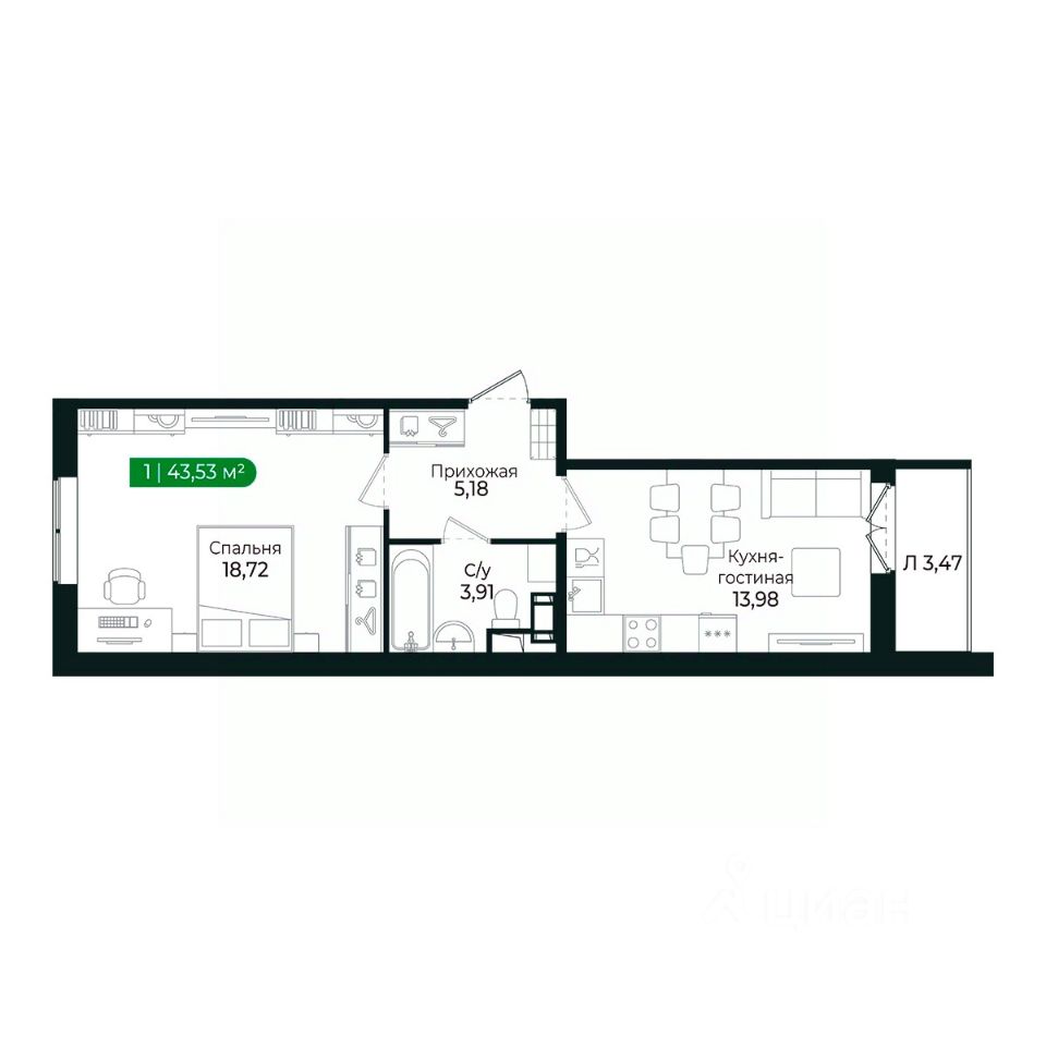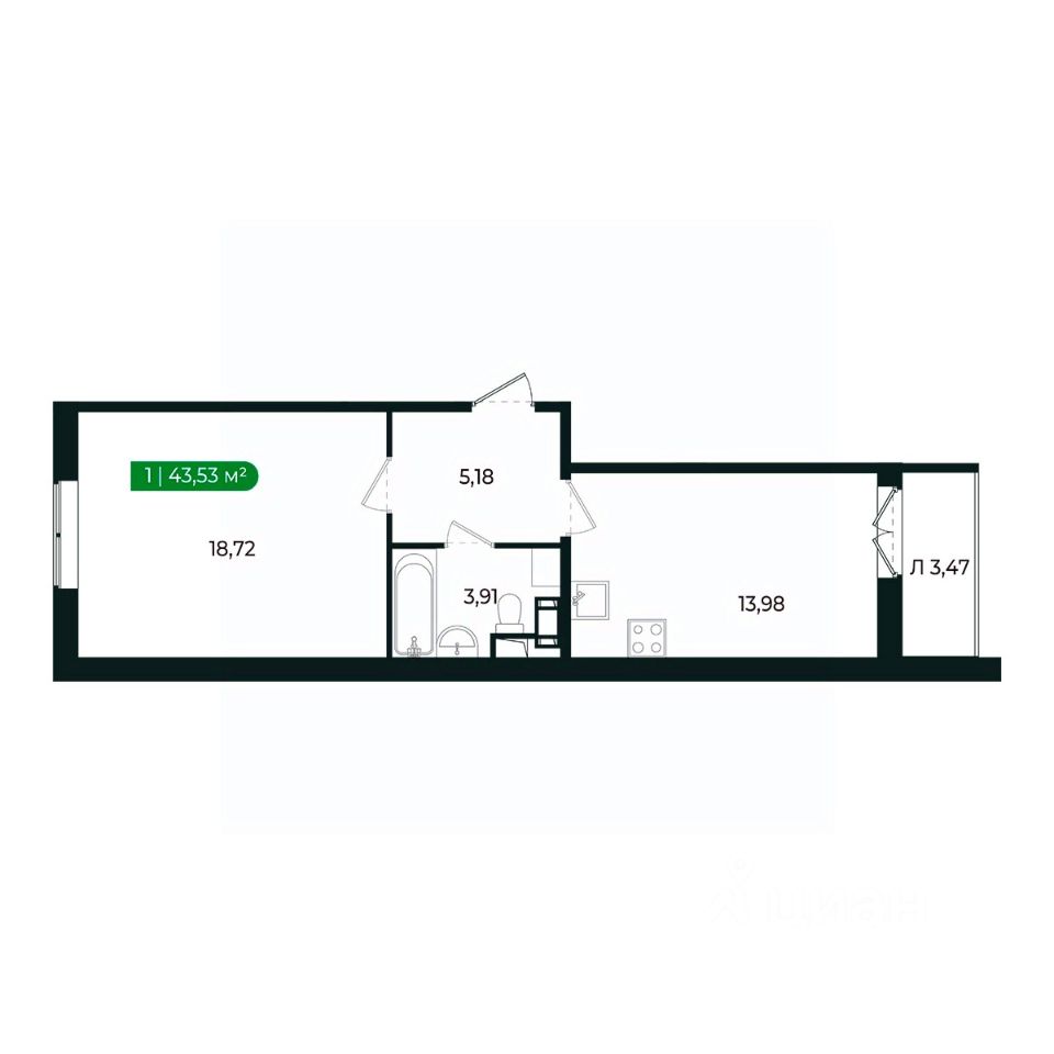 Кухня с балконом и жилая комната (18м2) разделены прихожей и санузлом и имеют правильную геометрию.