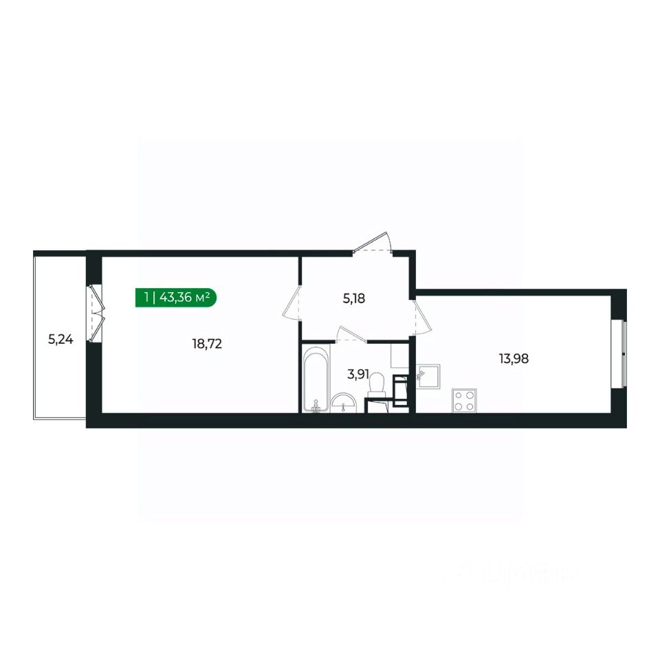 Кухня с балконом и жилая комната (18м2) разделены прихожей и санузлом и имеют правильную геометрию.