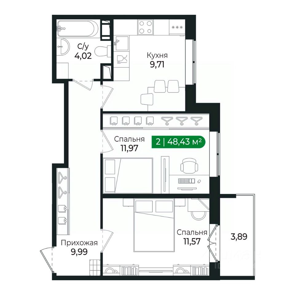Напрямую продаётся 2 комнатная квартира 277 на 4 этаже (из 8) общей площадью 48,43 м2 в III очереди в жилом комплексе Сертолово Парк от застройщика ГК Алгоритм.