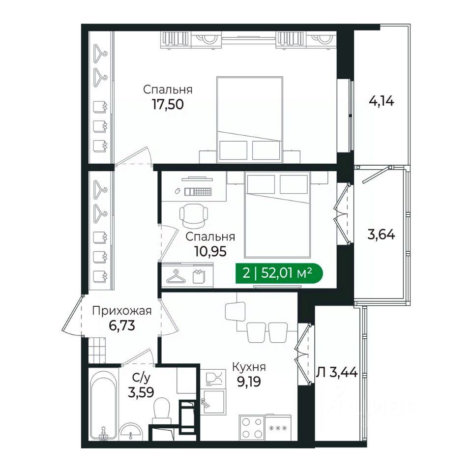 Напрямую продаётся 2 комнатная квартира 278 на 4 этаже (из 8) общей площадью 52,01 м2 в III очереди в жилом комплексе Сертолово Парк от застройщика ГК Алгоритм.