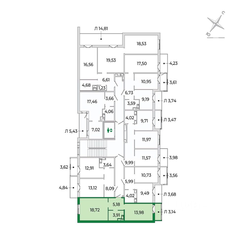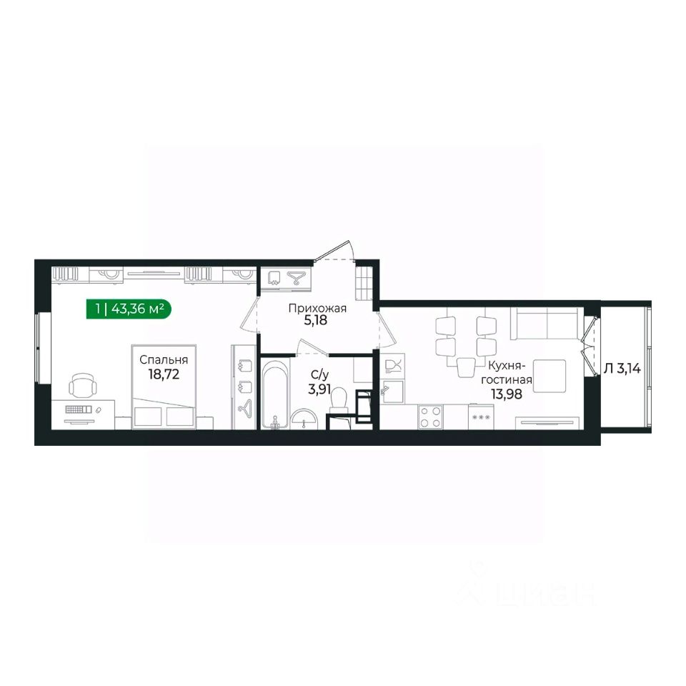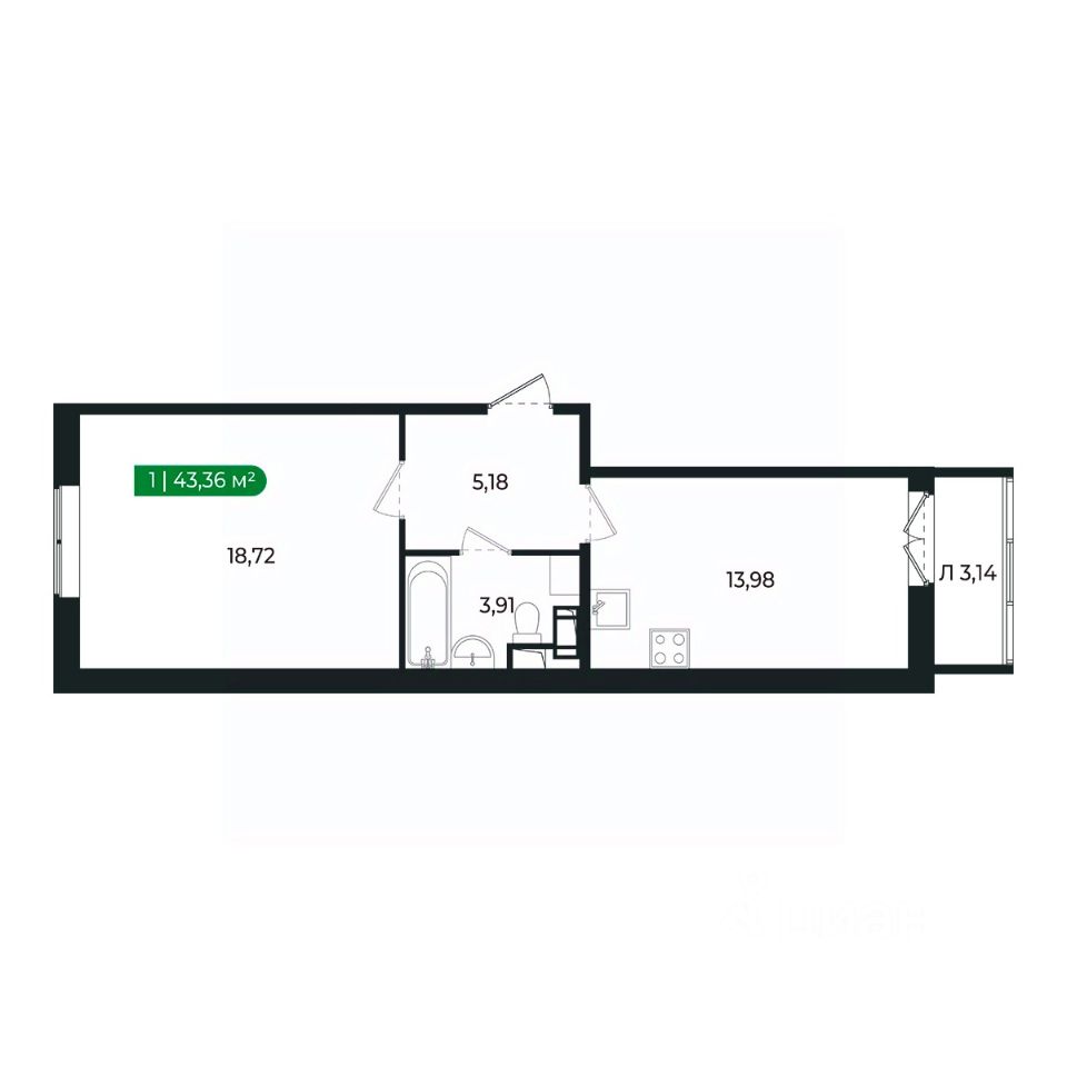 Кухня с лоджией и жилая комната (18м2) разделены прихожей и санузлом и имеют правильную геометрию.