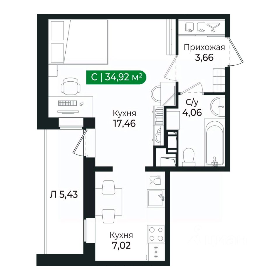 Система хранения располагается в прихожей, кухня помещается в нише, а полноценная спальня правильной формы.