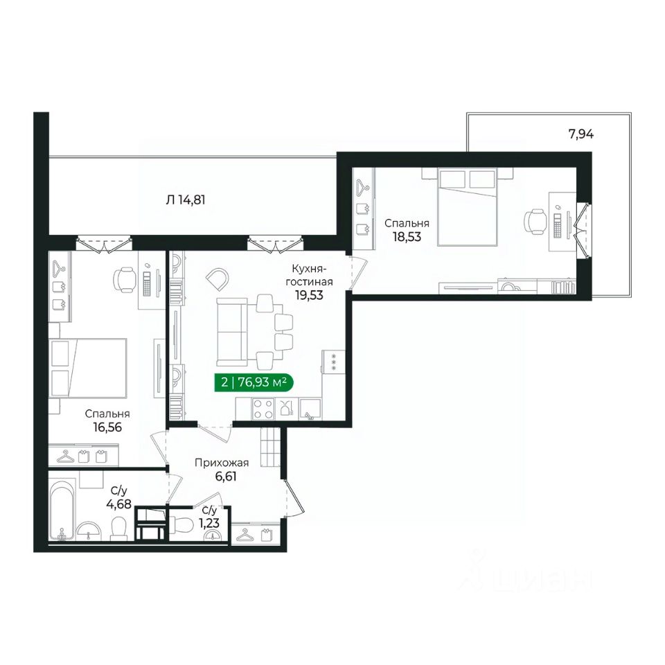 Напрямую продаётся 2 комнатная квартира 293 на 6 этаже (из 8) общей площадью 76,93 м2 в III очереди в жилом комплексе Сертолово Парк от застройщика ГК Алгоритм.
