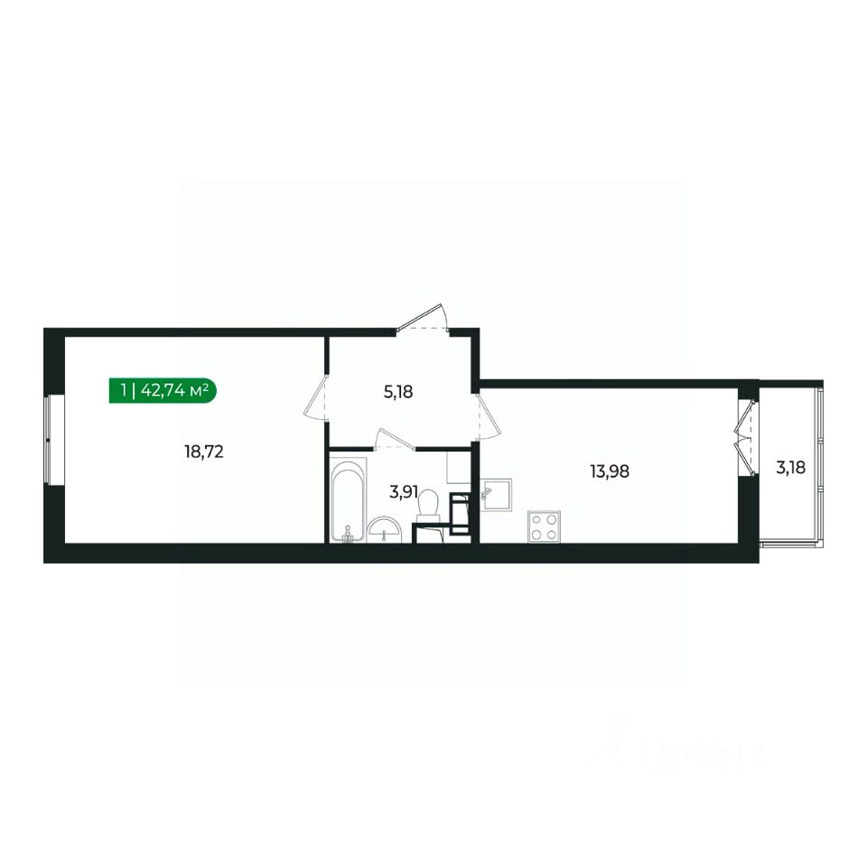 Кухня с балконом и жилая комната (18м2) разделены прихожей и санузлом и имеют правильную геометрию.