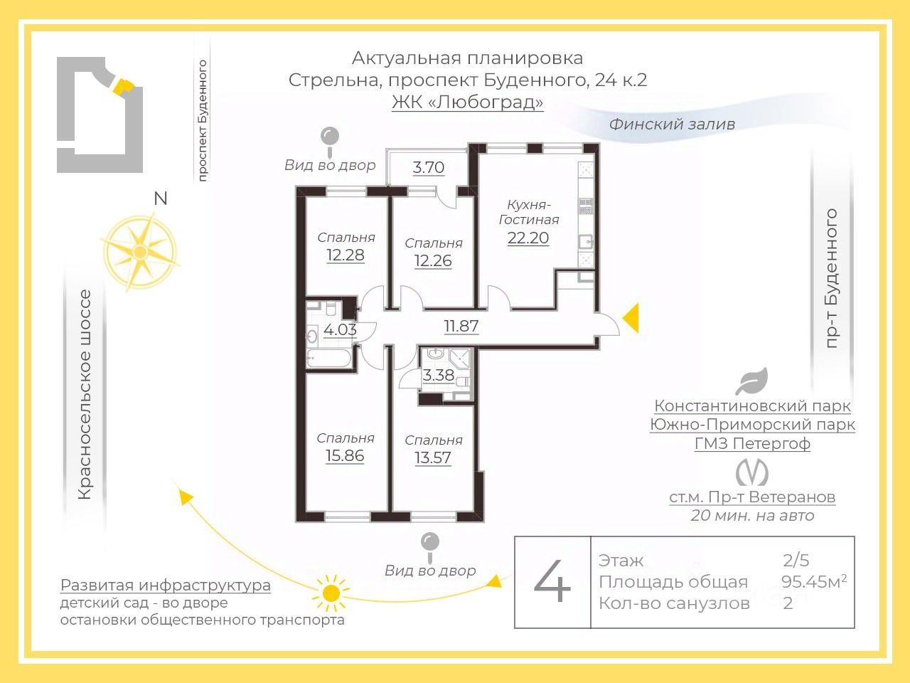 Эргономичная планировка: квадратная кухня 22,2 кв.м, 4 полноценные комнаты: 13,57+15,86+12,28+12,26 м2, коридор 11,87 м2, два санузла - 3,38+4,03 кв.м;