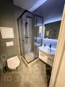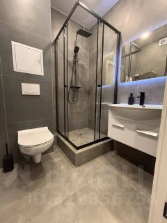 - санузел отделан керамогранитом, установлена инсталляции фирмы Damixa, импортная сантехника и тумба под раковину, зеркало с подсветкой