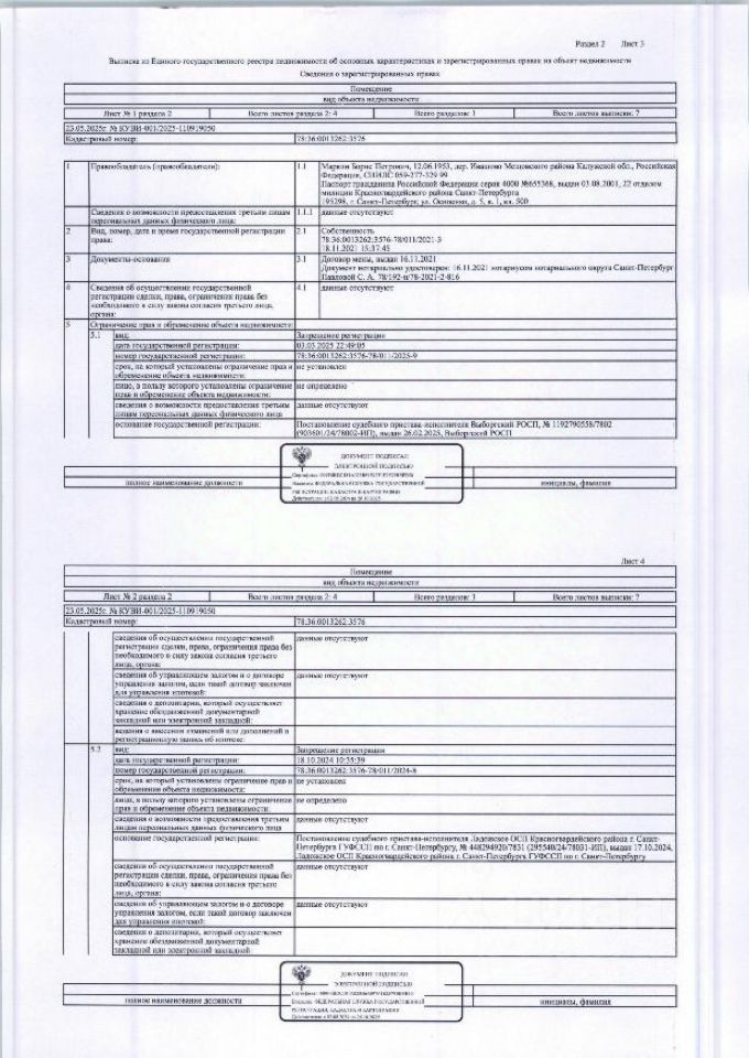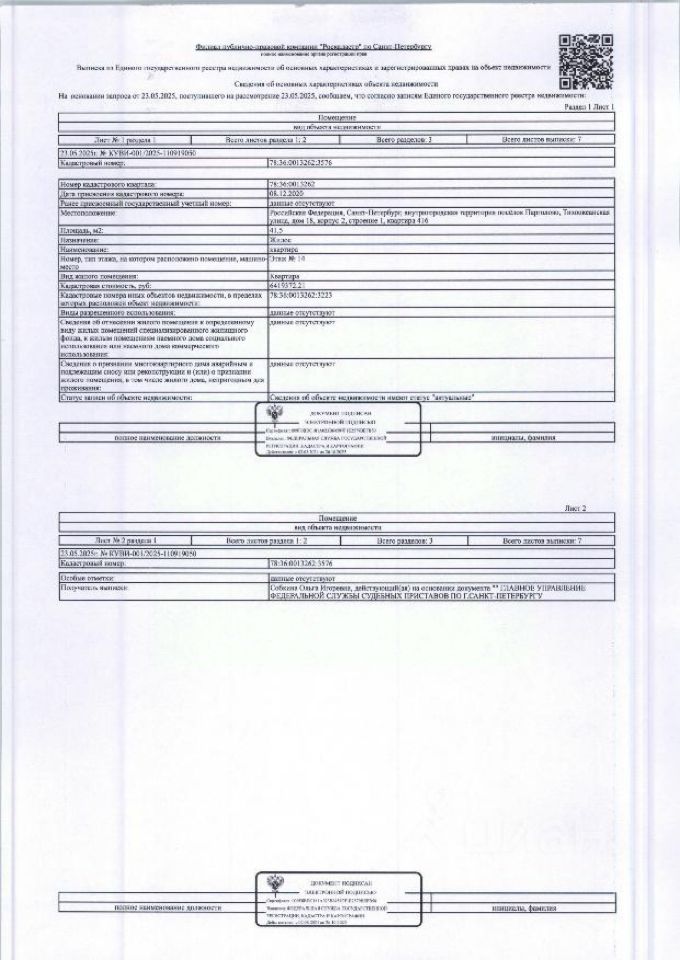 Квартира, расположенная по адресу: Санкт-Петербург, п. Парголово, Тихоокеанская ул., д. 18, корп. 2, стр. 1, кв. 416 общ. пл. 41,5 кв. м., кад. номер 78:36:0013262:3576