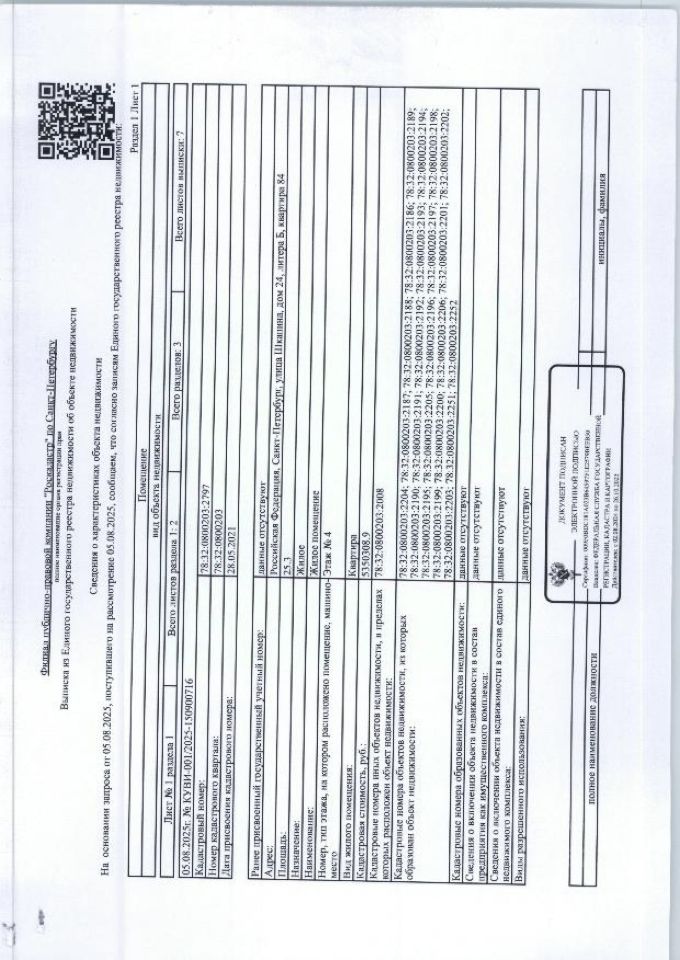 Квартира, расположенная по адресу: Санкт-Петербург, ул. Шкапина, д. 24, литера Б, кв. 84 общ. пл. 25,3 кв. м., кад. номер 78:32:0800203:2797