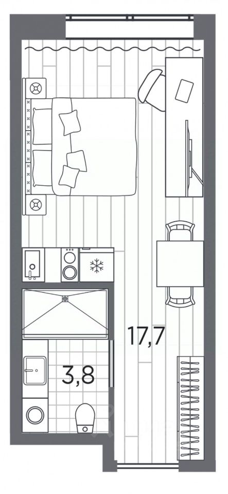 Однокомнатные апартаменты-студия от застройщика с отделкой в ЖК "Industrial AVENIR" на 11 этаже. Общая площадь: 21.5 кв.м., площадь гостиной 17.7 кв.м., из которых 5 кв.м. выделено под кухонную зону. Все окна выходят на одну сторону. В апартаментах один совмещенный санузел. Высота потолков 2.5 м.