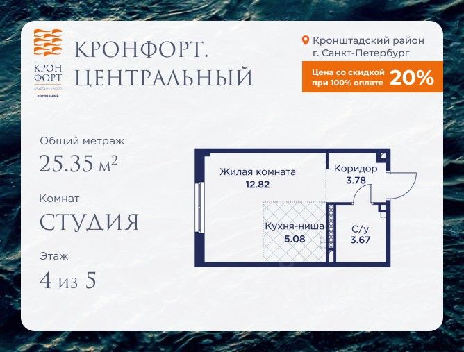 Предлагается квартира площадью 25.35 кв.м в жилом комплексе "Кронфорт. Центральный" в Санкт-Петербурге (Кронштадт). Возможна покупка с использованием льготных и специальных ипотечных программ с государственной поддержкой.