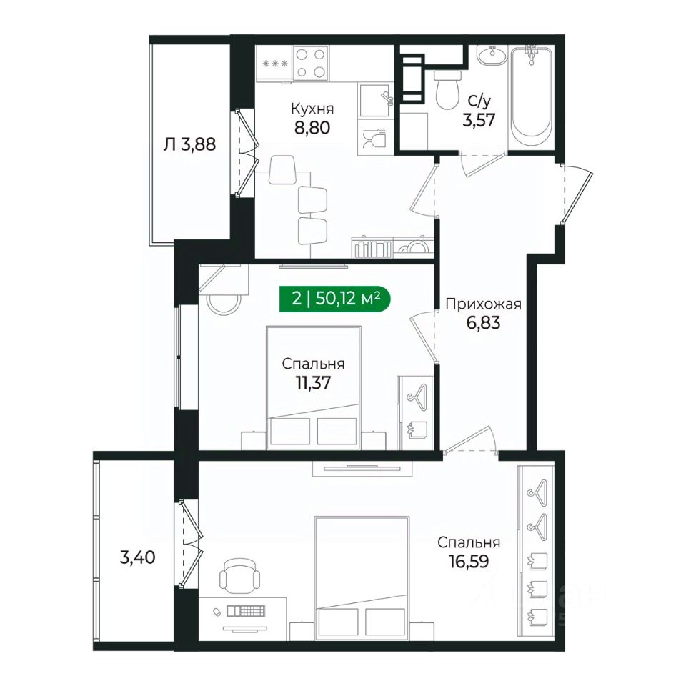 Напрямую продаётся уютная 2-комнатная квартира 353 общей площадью 50,12 м2 во II очереди в жилом комплексе Сертолово Парк от застройщика ГК Алгоритм.