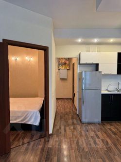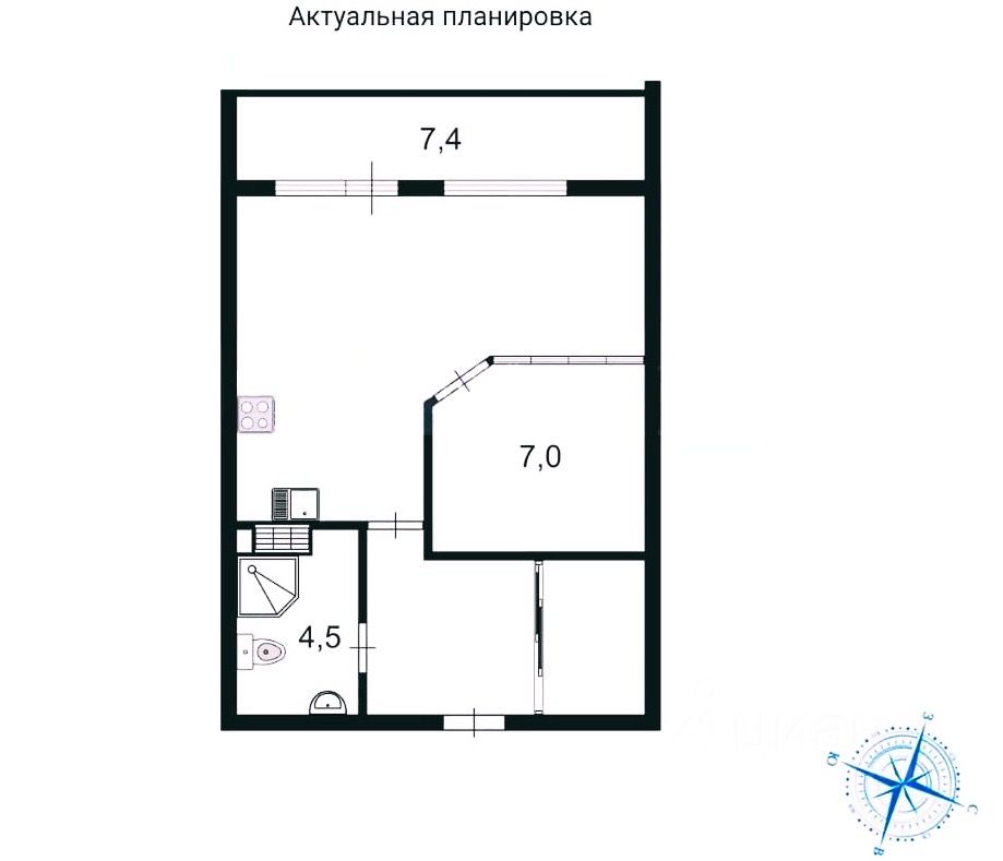 Комната и кухня - единое пространство, но с выделенной в нём спальным помещением со световыми окнами и встроенным шкафом. Совмещённый санузел с душевой кабиной. Вместительная гардеробная в прихожей. Просторная (7,50 кв.м.) застеклённая лоджия.