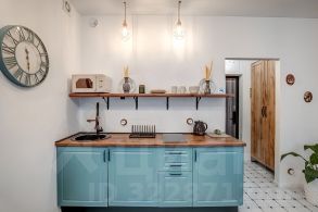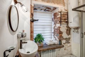 Квартира интересной планировки с окном в ванной и двумя окнами в самой комнате-студии.