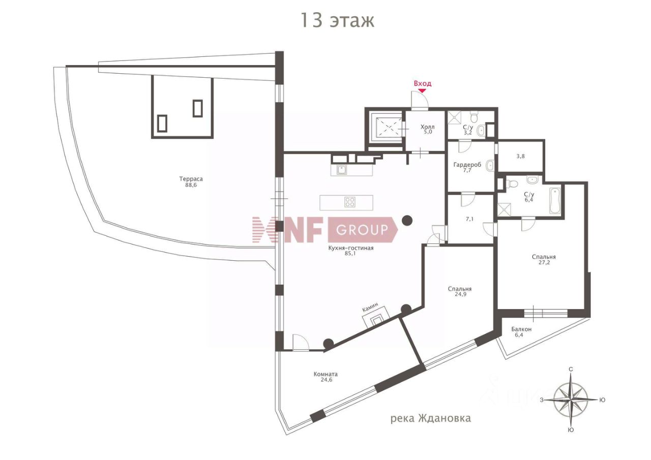 Планировка включает в себя: кухню-гостиную площадью 85,1 кв. м, три просторных спальни и большую террасу 88,6 кв.м.