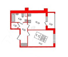 Однокомнатная квартира общей площадью 35.4 кв.м + большая лоджия 3.57 кв.м. Комната 14.1, кухня 10.2, санузел 4.4 метра.