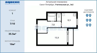 Общая площадь квартиры составляет 35,5кв. м, жилая площадь - 16 кв. м, кухня — 8,3 кв. м. Высота потолков — 2.7 метра. Застекленная лоджия.