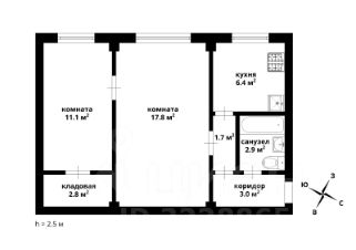 Квартира светлая, комнаты 17,8 м2 и 11,1 м2, в маленькой комнате приятный бонус - кладовая 2,8 м2 - вполне подойдет под гардеробную. Квадратная кухня 6,4 м2.