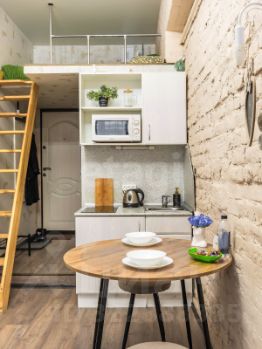 - Планировочное решение включает функциональную кухонную зону, оборудованную всей необходимой техникой, и гостевую зону с диваном и столом.