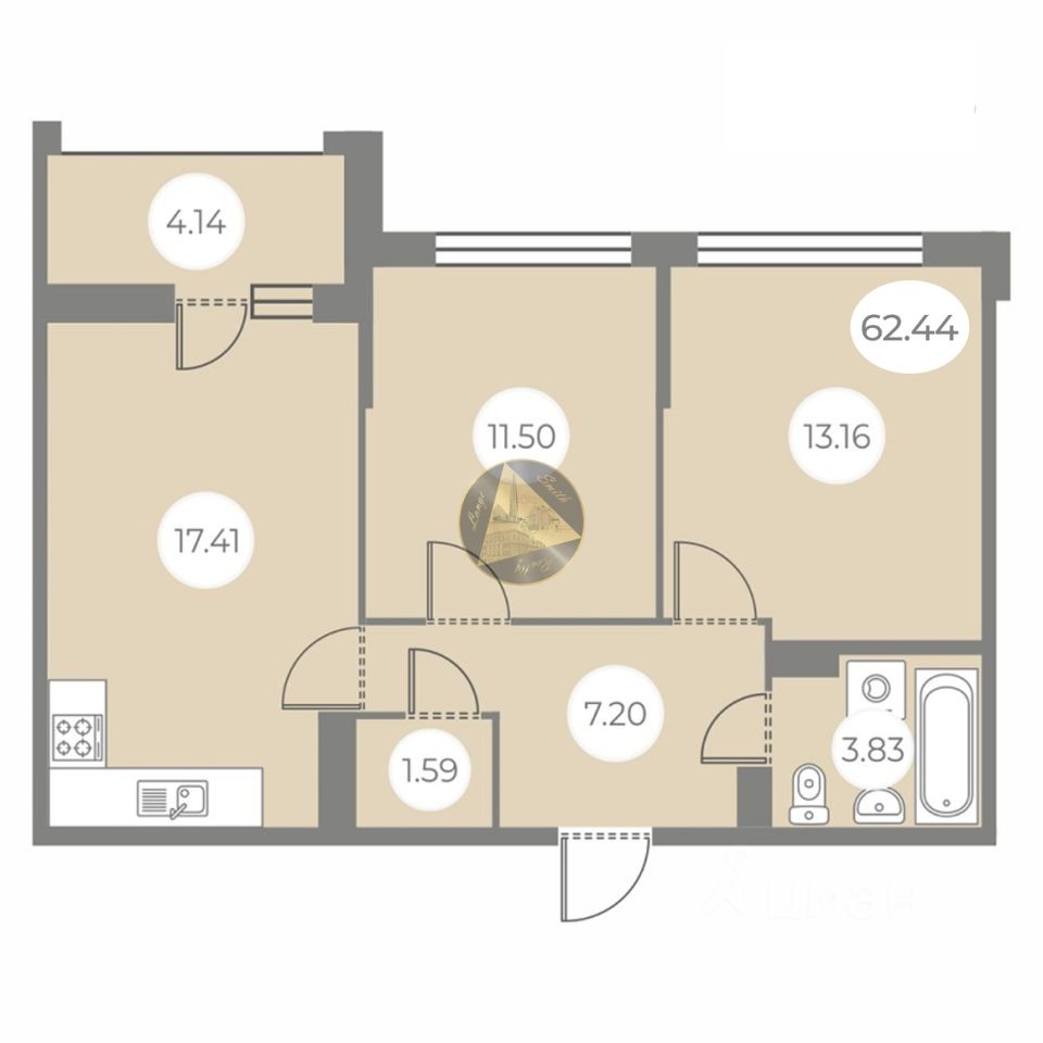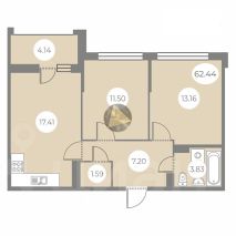 - Общая площадь квартиры 62.44 м2
