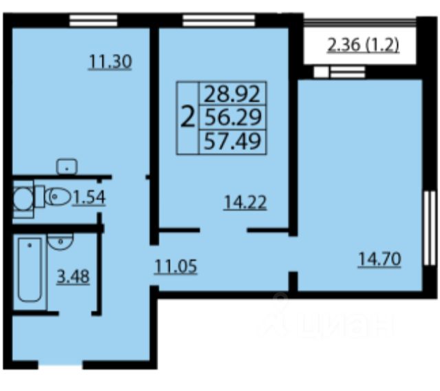 Общая площадь составляет 57 кв. м, из которых жилая площадь — 29 кв. м, а кухня — 10 кв. м.