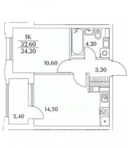 Общая площадь 32,6 кв.м, из которых 10,6 кв.м отведено под жилую площадь и 14.5 кв.м под кухонную зону, высота потолков 2,75.