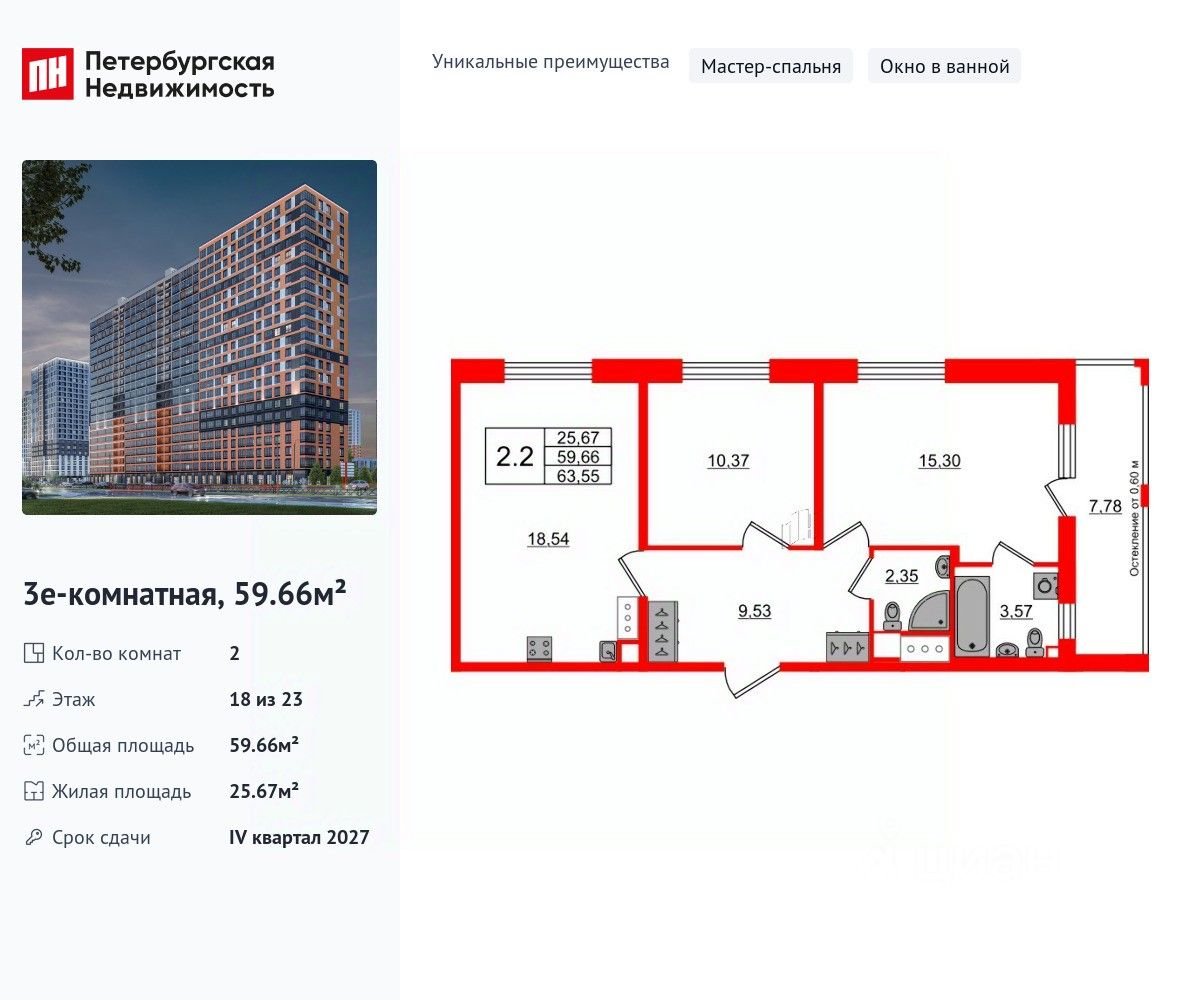 Уникальная, функциональная европланировка, большая кухня-гостиная 18.54 м², просторная прихожая 9.53 м². Общая площадь квартиры - 59.66 м², жилая 25.67 м², высота потолка 2.77 м.