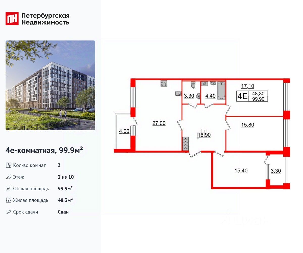Удобная, классическая, функциональная европланировка, большая кухня-гостиная 27 м², просторная прихожая 16.4 м². Общая площадь квартиры - 99.9 м², жилая 48.3 м², высота потолка 3 м.