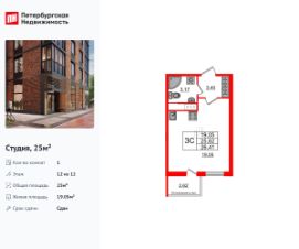 Удобная, классическая, функциональная европланировка, просторная прихожая 3.4 м². Общая площадь студии - 25 м², жилая 19.05 м², высота потолка 3 м.