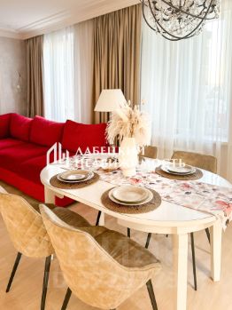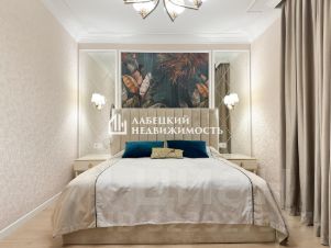 Большое внимание уделено внутреннему декору: текстиль и портьеры сшиты на заказ, настенные пано в виде картин, статуэтки, зеркала и вазы-все остается новым владельцам квартиры.