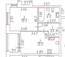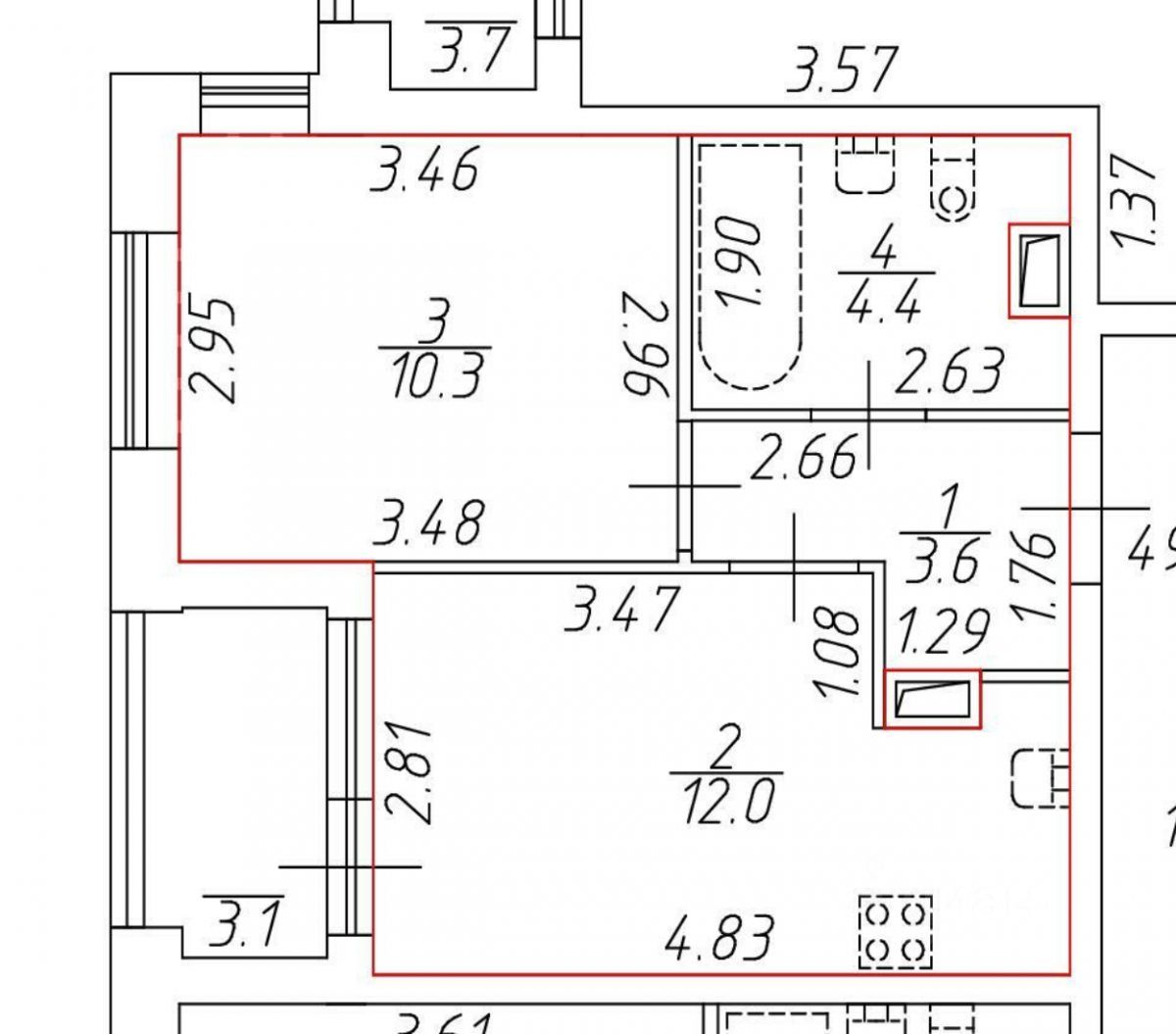 Идеальная планировка: спальня 10,3 м², кухня-гостиная 12 м², коридор 3,6 м², санузел 4,4 м² — все помещения правильной формы, без лишних потерь на площади.