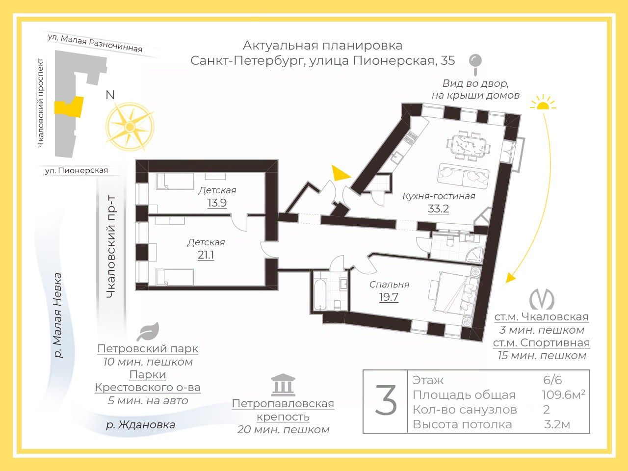 Эргономичная и продуманная 4-х сторонняя планировка включает в себя: 3 спальни, большую кухню-гостиную 33 метров, 2 совмещенных санузла и много мест хранения, а именно 2 гардеробные и кладовую. Заменены все окна и коммуникации от фановых труб до замены наполнения межэтажных перекрытий, а также согласованная планировка. Высокие потолки 3,2 метра. Если ищите тишины, то у нас последний этаж и произведена дополнительная шумоизоляция. Квартира легко проветривается и наполняется свежим воздухом, так как окна выходят на улицу и во двор. Остается вся необходимая мебель и техника для комфортного проживания, остается купить только тапочки.