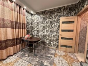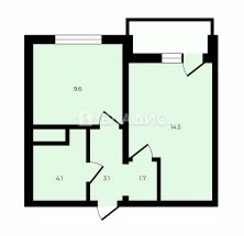 Общая площадь квартиры 33 м2, комната 14,5 м2 с выходом на большой балкон, кухня 9,6 м2 , совмещённый санузел. Квартира очень тёплая. В доме три лифта. Хорошие ,тихие соседи.