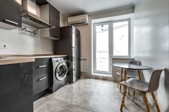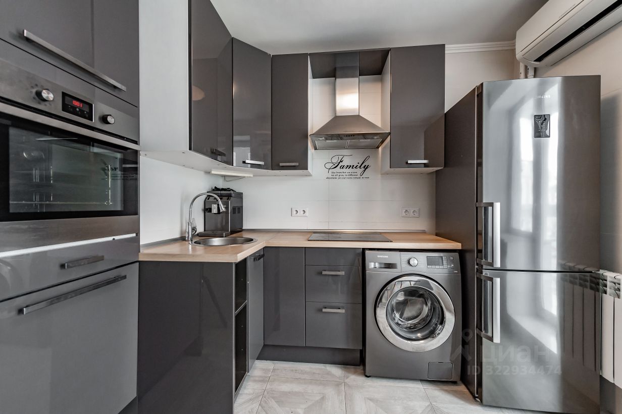 Встроенная кухня с техникой: духовой шкаф, варочная панель, вытяжка, холодильник, стиральная и посудомоечная машины.