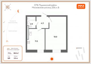 Однокомнатная квартира, площадью 36.8 м2, расположена на 5 этаже 9-этажного дома. Окна квартиры обращены в тихий спокойный двор.