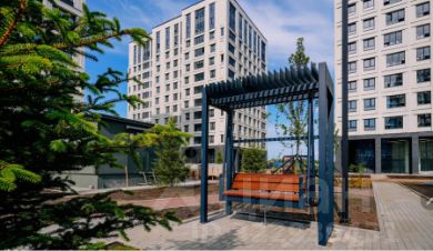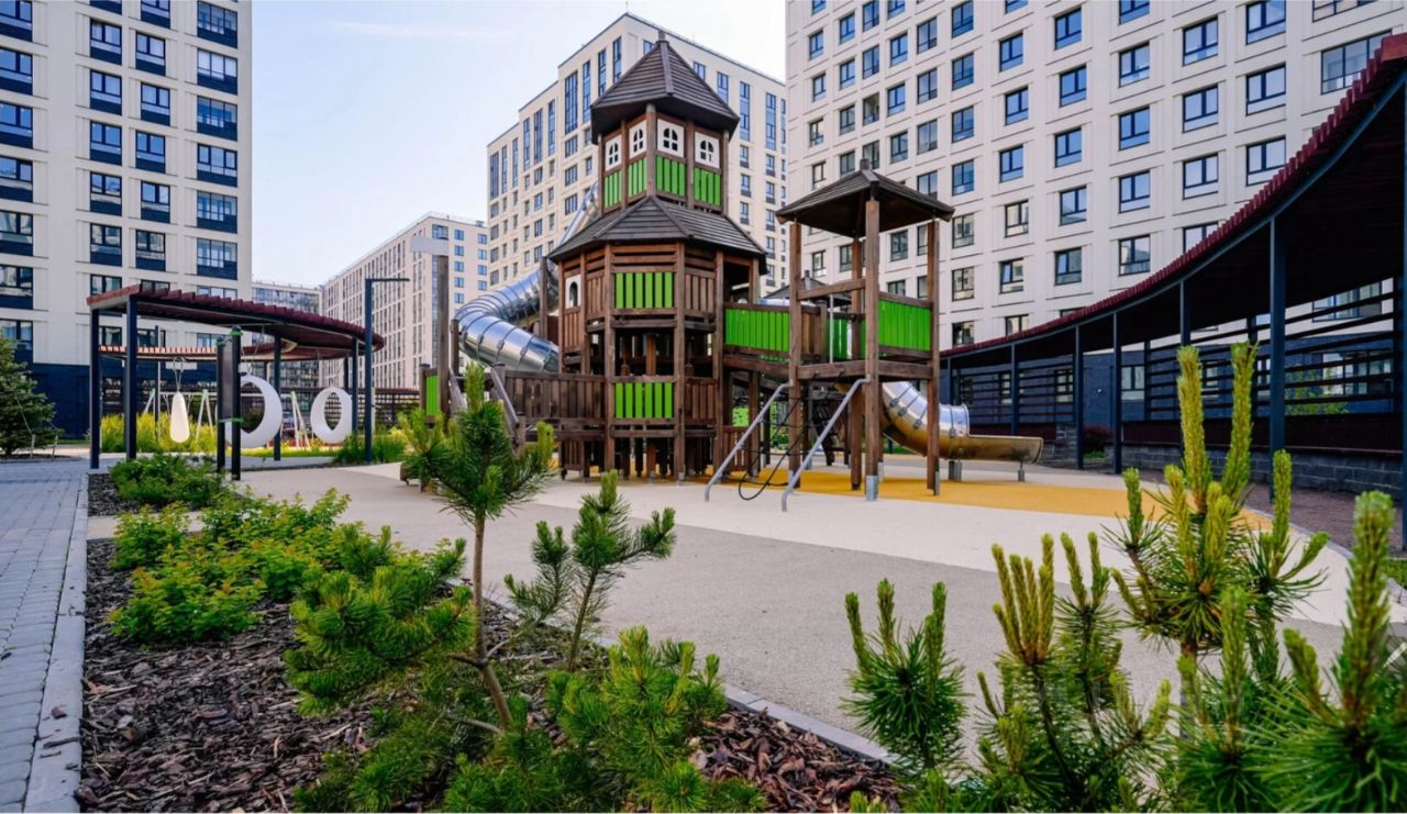 -закрытый двор без машин с детскими площадками, зонами отдыха и озеленением