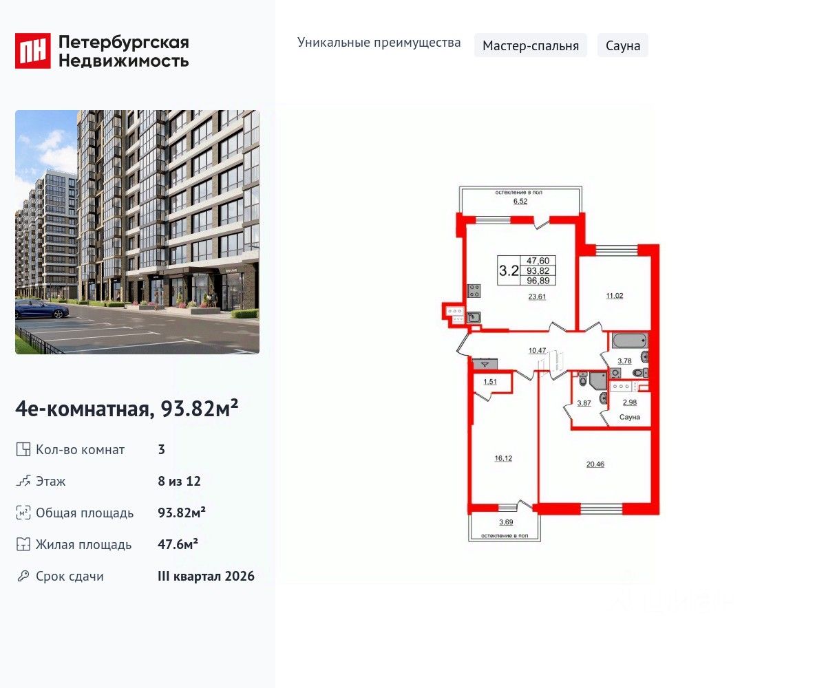 Уникальная, функциональная европланировка, большая кухня-гостиная 23.61 м², вместительная прихожая 10.47 м². Общая площадь квартиры - 93.82 м², жилая 47.6 м², высота потолка 2.77 м.