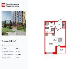Удобная, классическая, функциональная европланировка, просторная прихожая 3.37 м². Общая площадь студии - 24.7 м², жилая 18.03 м², высота потолка 2.77 м.