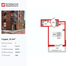 Удобная, классическая, функциональная европланировка, вместительная прихожая 2.85 м². Общая площадь студии - 26.4 м², жилая 20.65 м², высота потолка 2.77 м.