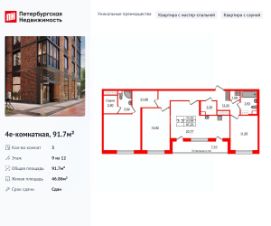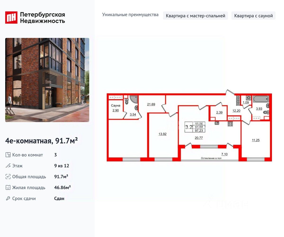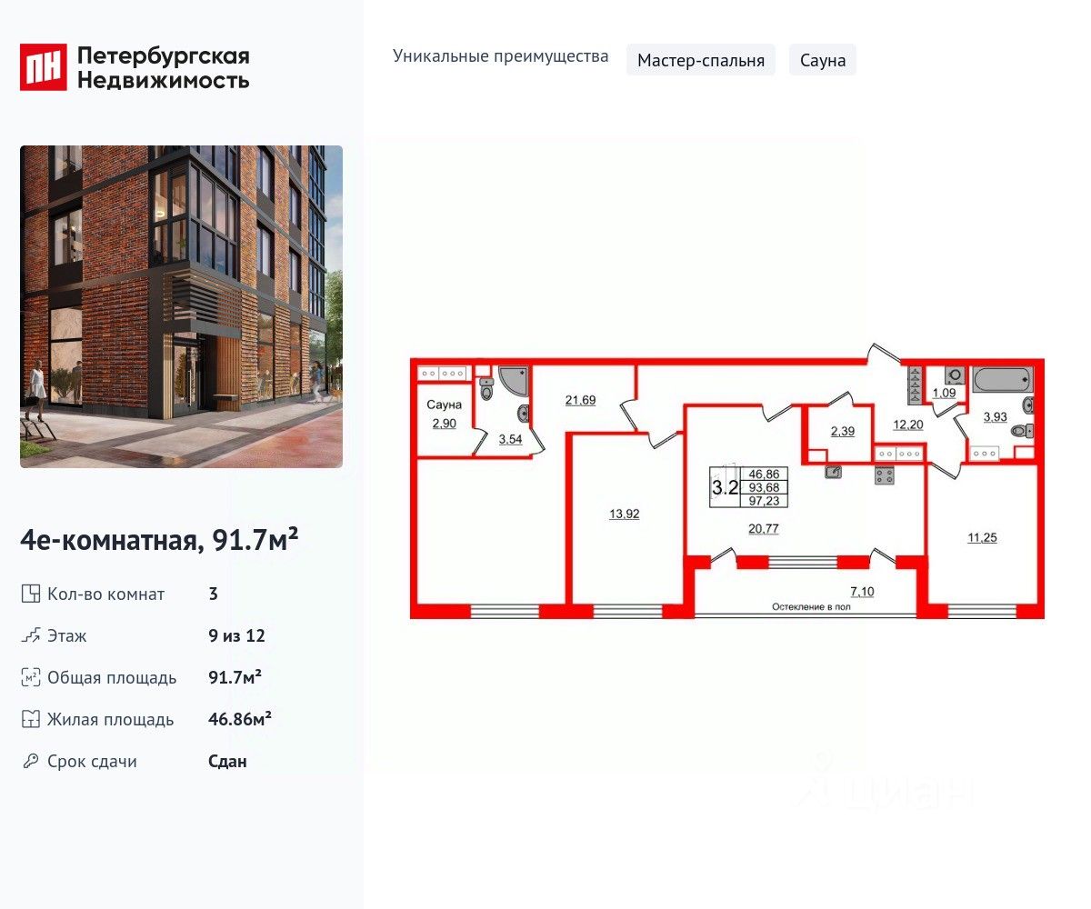 Уникальная, функциональная европланировка, большая кухня-гостиная 20.77 м², просторная прихожая 12.2 м². Общая площадь квартиры - 91.7 м², жилая 46.86 м², высота потолка 2.77 м.