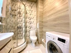 Санузел оборудован стиральной машиной, душевой кабиной и зеркалом с подсветкой.