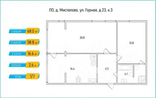 - комнаты — 25.0 кв. М + 13.8 кв. М. ;