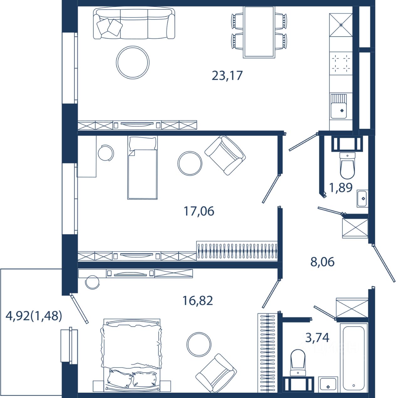 Апартамент 449 площадью 72,22 кв.м. в корпусе Aqua с видом во двор и на улицу