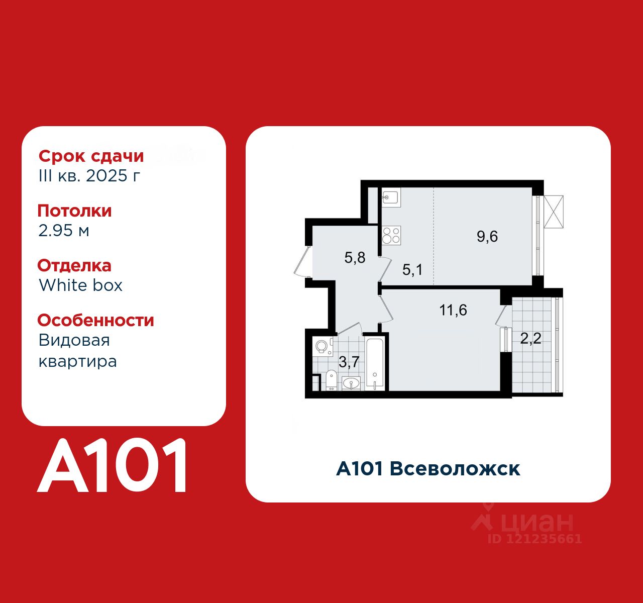 Видовая 1-комнатная квартира площадью 38.10 в ЖК "А101 Всеволожск" c лоджией на 12 этаже. Квартира white box. Вид из окна во двор. В квартире 1 санузел. Высота потолков 2.95 м.