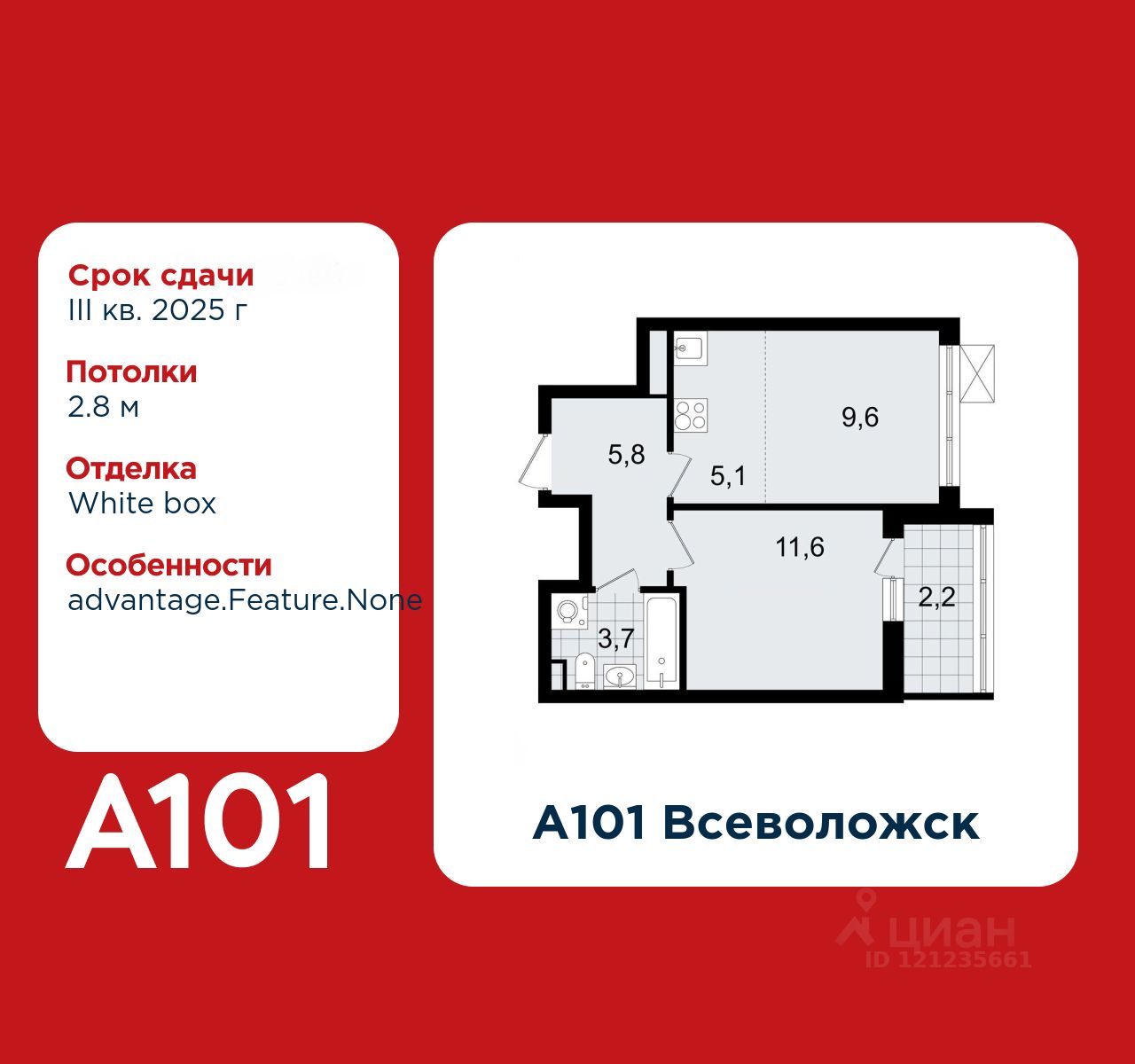 1-комнатная квартира площадью 38.40 в ЖК "А101 Всеволожск" c лоджией на 10 этаже. Квартира white box. Вид из окна во двор. В квартире 1 санузел. Высота потолков 2.8 м. Ключи в 2025 году.