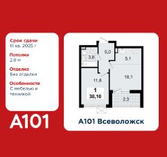 1-комнатная квартира площадью 38.10 в ЖК "А101 Всеволожск" c лоджией на 7 этаже. Квартира без отделки. Вид из окна на улицу. В квартире 1 санузел. Высота потолков 2.8 м. Ключи в 2025 году.
