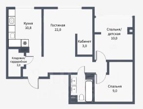 По документам двухкомнатная квартира. По факту - две изолированные спальни, гостиная с обособленной зоной кабинета , кухня, совмещенный санузел и кладовая/гардеробная.